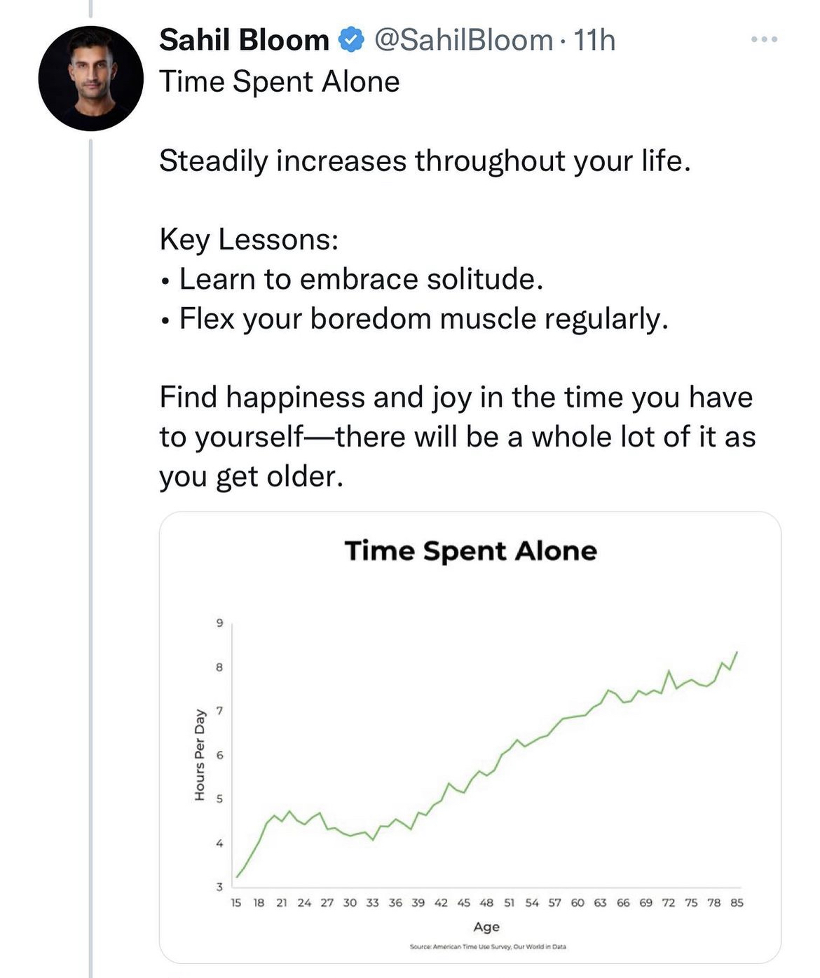 At the end of the day, the time spent alone will increase throughout your life. As Sahil Bloom put it, let’s embrace our solitude.